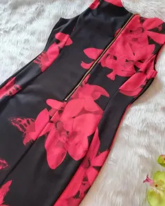 Vestido casual negro corto floreado. Lindo vestido negro con flores rojasSin mangas, cierre funciona bienLlega abajo de la rodillaLa tela estira pero no queda justo