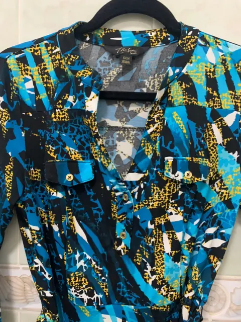 Vestido casual Thalía Sodi. Vestido midi, manga larga, con 2 bolsillos enfrente y botones a medio pecho. Tela de poliéster.Medidas/ espalda: 37 cm, busto: 43 cm, cintura: 39 cm, largo: 91 cm, largo de mangas: 43 cm.