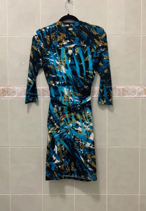 Vestido midi, manga larga, con 2 bolsillos enfrente y botones a medio pecho. Tela de poliéster.Medidas/ espalda: 37 cm, busto: 43 cm, cintura: 39 cm, largo: 91 cm, largo de mangas: 43 cm.