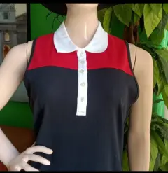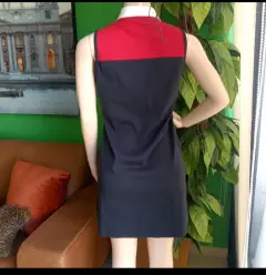 Vestido color azul marino con franja en el pecho color rojo, cuello tipo polo en color blanco, con botones. Logo de la marca bordado en la parte de abajo.Talla M- hombro a hombro: 32.5cm- Axila a axila: 46cm- Largo: 89cmMaterial:👉100% algodónMarcas originales importadas de USA.