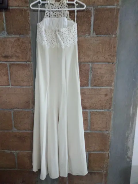 Vestido ceremonia. Vestido largo, torso con piezas de aplicaciones bordadas, espalda alta con tiras, corte princesa, más largo de atrás.
