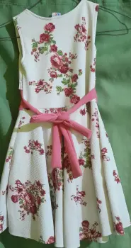 Vestido circular tono beige y flores incluye torera. 65 cms largo, manga corta e incluye torera. Talla chica en junior.