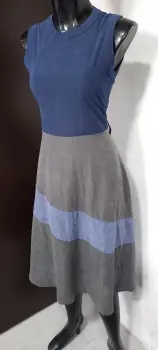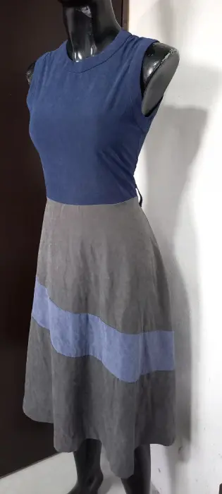 Vestido circular de ante sin manga. Gracias por tu visita ..En esta ocasión te traemos:..................................................................................TALLA xsMARCA iveeCOLOgris con azulSTRECH noTELA gamusaMADE IN usaMEDIDAS HOMBRO 32 cmAXILA 42 cmCINTURA 36 cmCADERA es sueltoLARGO 107 cm Desde el hombroLas medidas son de lado a lado de la prenda