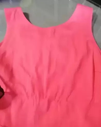 Vestido circular sin mangas. Es color durazno, la tela es gruesa, queda corto un poquito arriba de la rodilla, la tela estira bastante bien, muy favorecedor porque tiene peto alto. Luce muy lindo con zapatillas, para un look divertido casual. Sin detalles y en excelentes condiciones.