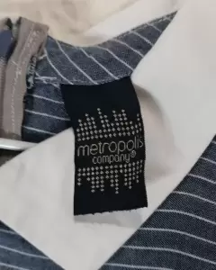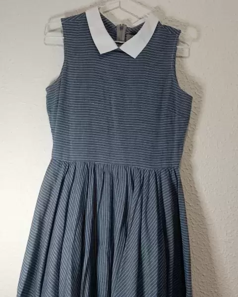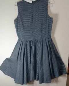 Vestido conservador clasico con cuello sin mangas asinturadoColir azul con rayas blancasMas juvenil que de adulto