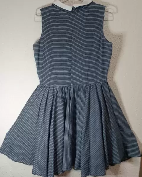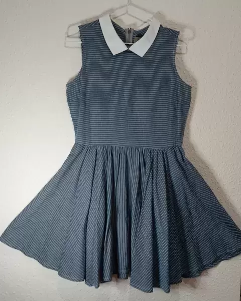 Vestido clásico azul con rayas blancas. Vestido conservador clasico con cuello sin mangas asinturadoColir azul con rayas blancasMas juvenil que de adulto