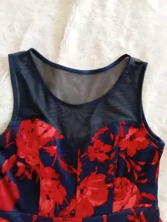 Vestido de cocktail, azul con flores rojo, escote en forma de corazón, transparencia azul en el pecho, con cintura, corte A con vuelo. Talla 6.Poliester y tela Spandex.