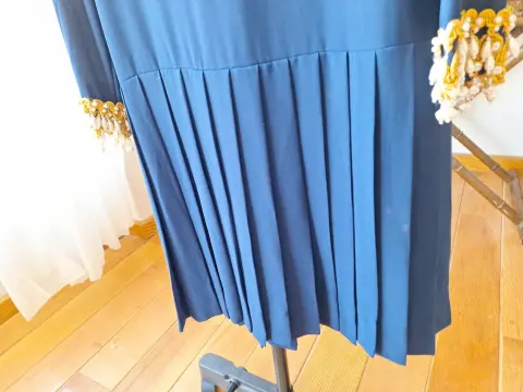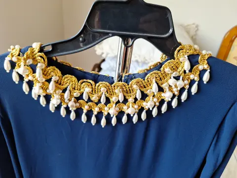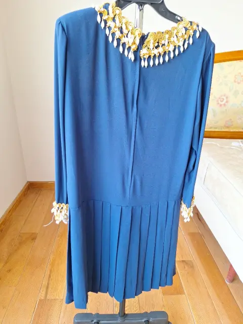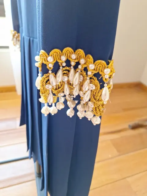 Vestido abajo de la rodilla color azul con falda plisada, cuello redondo y mandas largas. Tiene detalles bordados en dorado y perla en cuellos y mangas