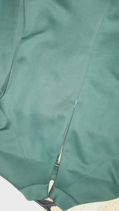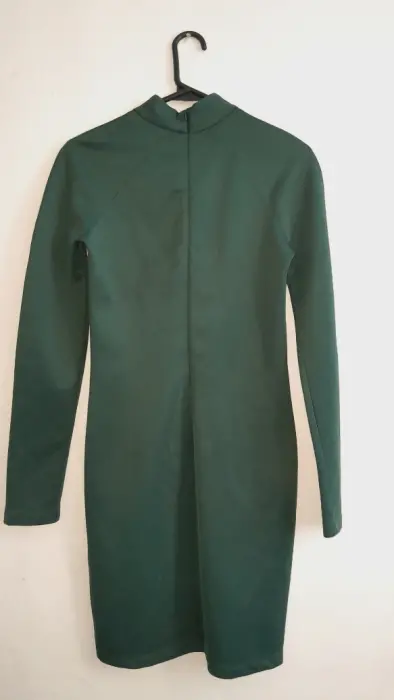 Vestido discreto y elegante, ideal para cena o ceremonia informal, manga larga con cuello, color verde botella