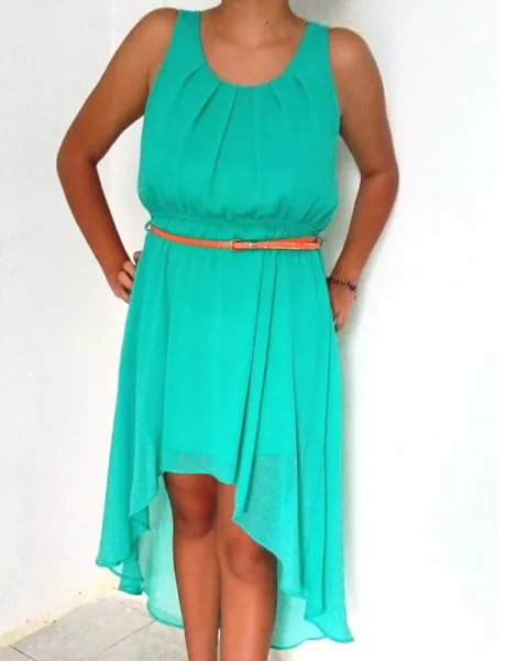 Vestido cola de pato color verde aqua con elástico en la cintura, trae un cinturón delgado que se puede dejar o quitar pero el cinturón por estar guardado se ve como desgastado, sin embargo puedes completar con cualquier otro accesorio de tu gusto el vestido ya que está en perfecto estado, lo usé una sola vez, es muy cómodo, talla L.