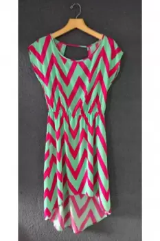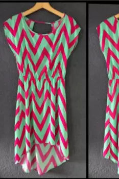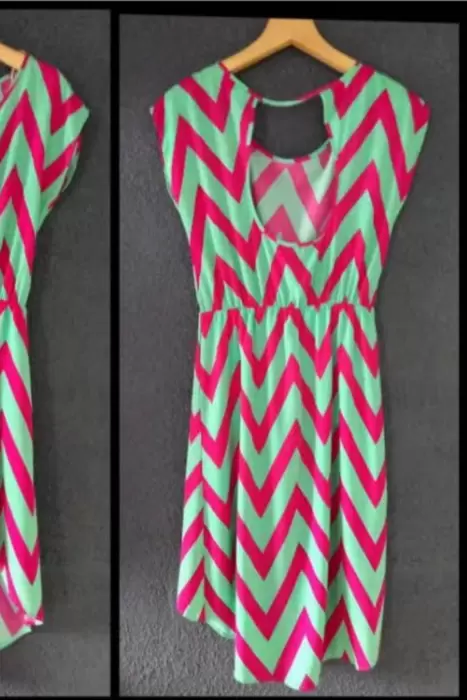 Vestido manga corta, cola de pato, estampado a rayas bicolor, con escote en espalda, Y resorte en cintura.