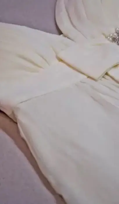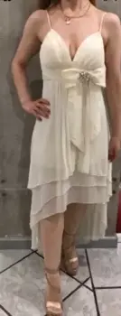 Vestido de chiffon color crema es talla 7 pero está reducido, al frente es más corto que por detrás, tiene lazo con moño y pedrería, escote de corazón lleva tirantes, se ve muy bien puesto y es ideal para fiestas Dra to de noche como de día