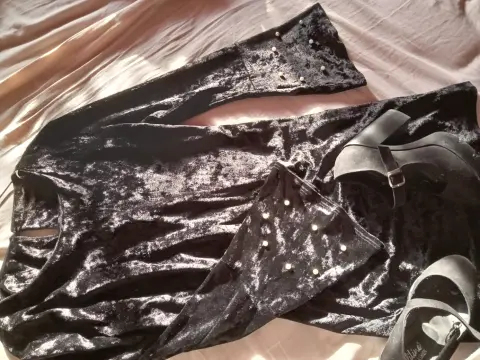 Bello vestido tipo gamuza ,negro con mangas campana y perlitas blancas ,es liso y se acopla muy bien a tu figura .Yo siempre soy talla mediana y me queda perfecto .
