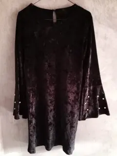 Vestido color negro y manga campana. Bello vestido tipo gamuza ,negro con mangas campana y perlitas blancas ,es liso y se acopla muy bien a tu figura .Yo siempre soy talla mediana y me queda perfecto .