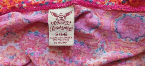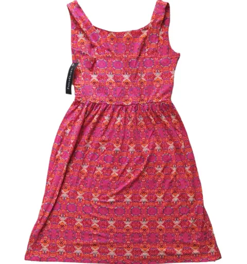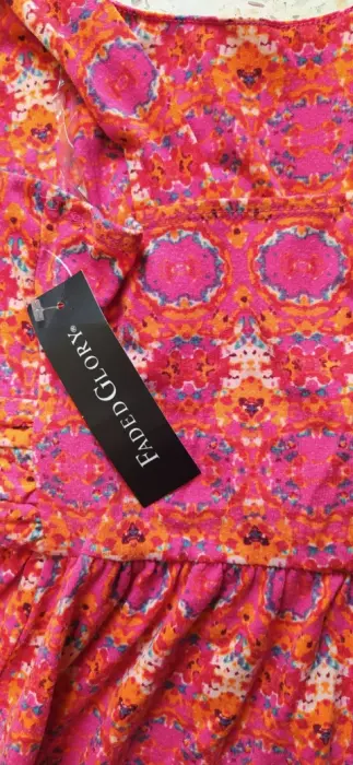Vestido de colores llamativos, marca Faded Glory, talla S pero queda a una M también, 95% poliéster y 5% spandex. Tiene resorte en la cintura que estira. Nuevo con etiqueta.Hombro a hombro 35 cm.Axila a axila 39 cm.Largo total 75 cm.Resorte en cintura 33 cm, estira.