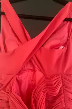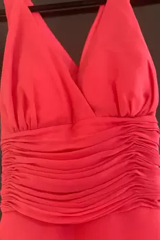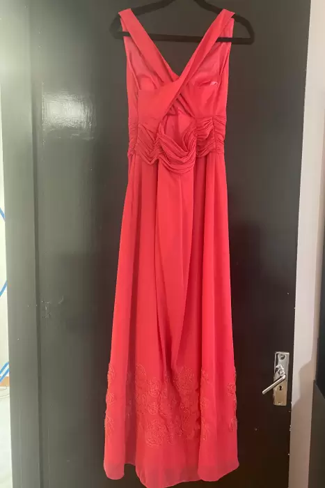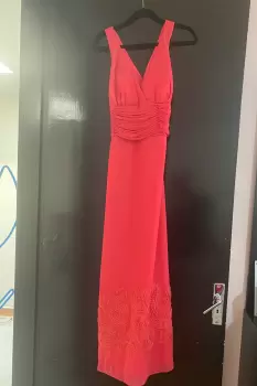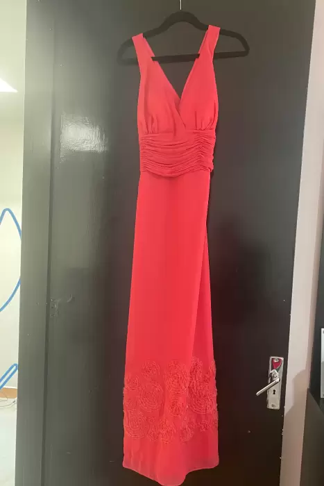 Vestido Con escote cruzado espalda. El vestido es precioso, tiene unas aplicaciones de flores en el ruedo, la espalda es cruzada y ligeramente escotada, tiene copas incluidas, y un fruncido a la cintura que da una forma al cuerpo muy bonita, todo el vestido tiene forro y es muy cómodo. Talla 9