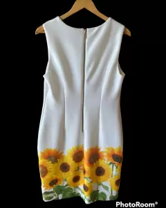 Vestido con estampado de girasoles. Vestido blanco con estampado de girasoles en la falda, sin manga