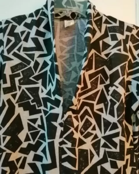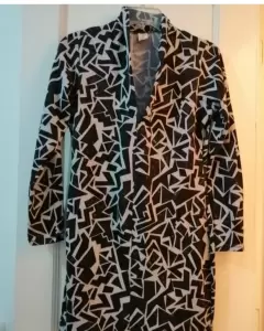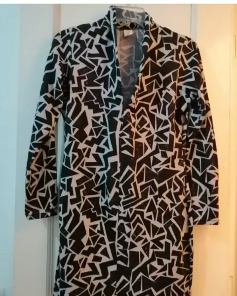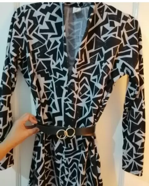 Precioso vestido de punto tela gruesa, con estampado geométrico, no incluye cinturón, tiene un cuello alto en V, un vestido muy formal y elegante