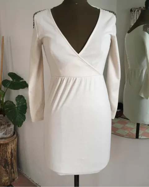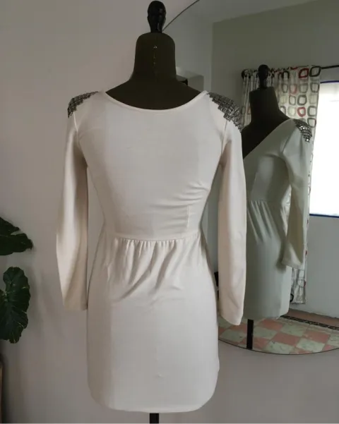 Vestido escotado y ajustado con divertidos estoperoles en los hombros. La tela es gruesa, no se transparenta.
