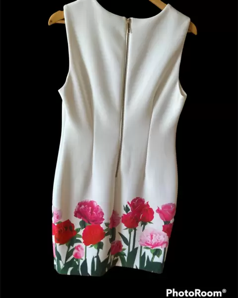 Vestido con flores rosadas. Vestido blanco con flores en la falda color rosas