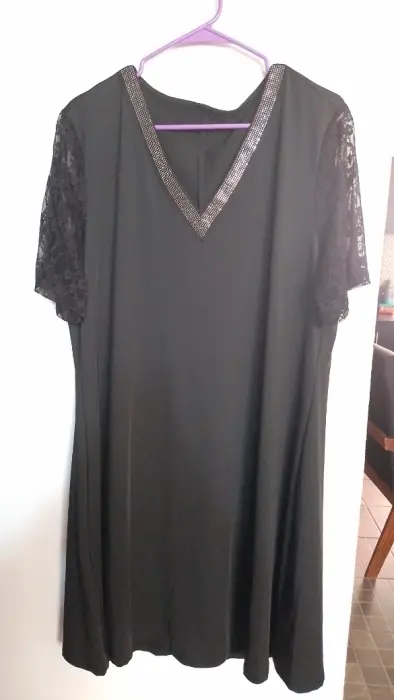 Vestido con mangas de encaje y brillos en el cuello V 112 cm pecho, 136 cm cadera, 100 cm largoEnvio a la brevedadTodas las compras incluyen obsequioAcepto ofertas