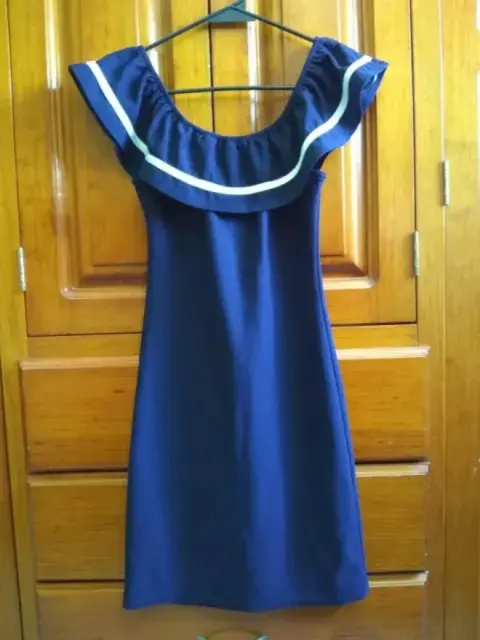 Lindo vestido ceñido al cuerpo con escote de olan. La tela estira un poco.La talla dice M, pero queda a un SPuedo hacerte un paquete con otra prenda que te guste para qué tú envio, te sea cómodo 😃