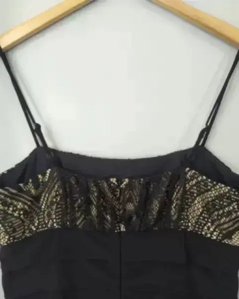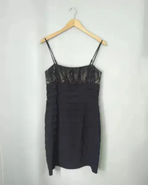 Vestido corto negro con olanes y encaje en la parte del pecho.Los tirantes se ajustan.Medidas aproximadas:Pecho 80 cmCintura 76 cmLargo desde hombros 92 cm