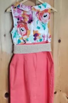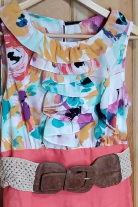 Vestido con olanes. Talla 4No incluye cinturónBusto: 88.9 cmCintura: 69.85 cmCadera: 95.25 cmLargo de la blusa: 30.48 cmLargo de la falda: 62.23 cmTiene 3 ojalitos (uno al frente y dos de cada lado) para usar cinturón.Hecho en FilipinasMaterial de la blusa: 100% poliésterMaterial de la falda: 77% algodón, 22% poliéster y 1% spandexForro de la blusa: 100% poliéster