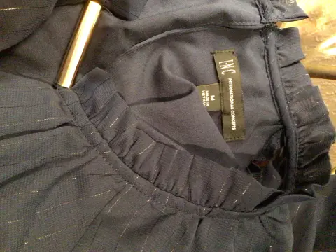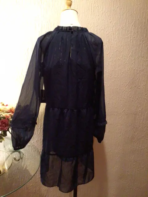 VESTIDO MARCA INC INTERNATIONAL CONCEPS, TALLA M COLOR AZUL MARINO, CON OLANES MANGA LARGA, CUELLO REDONDO CON PEQUEÑO OLÁN, BOTÓN EN LA PARTE DE ATRAZ, CON ETIQUETA, ESPECTACULAR