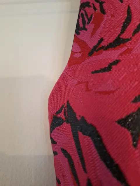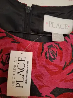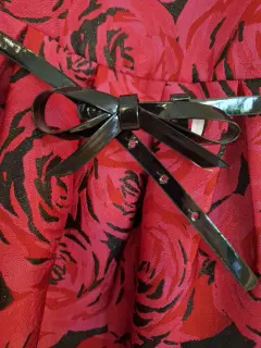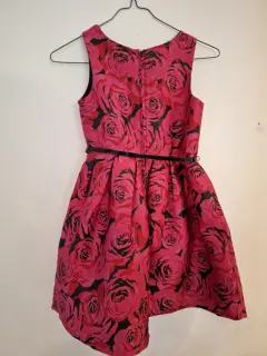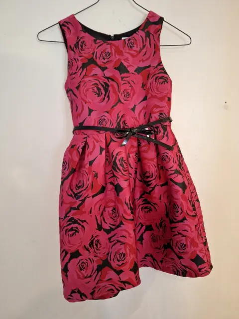 Vestido con rosas color rojo.. Sin mangas, incluye zipper en la parte posterior del vestido, talla 6x/7, incluye cinto negro en la cintura.