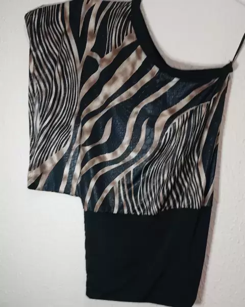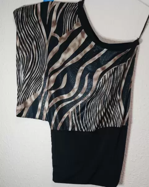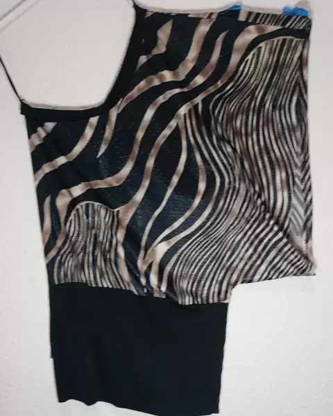 Vestido muy sexy que se amolda al cuerpoUna manga es aguada tipo vampiro y la otra manga es desnudaLa parte decla falda es entallada y cortaIdeal para una comida elegante o una fiesta de día