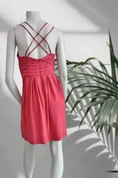 Vestido corto color coral, tirantes cruzados en espalda con bolsas laterales, Tela Spandex.