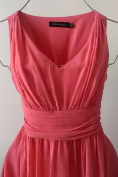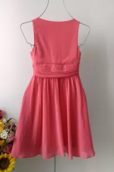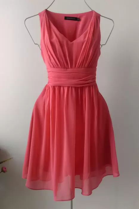 Hermoso vestido color coral vibrante con hermoso corte sin mangas y con fajilla en cintura. Hecho de tela muy suave tipo gasa y con forro.Marca Ever Pretty.(americano)Talla Chica.Medidas:Pecho 80 cm, ajusta hasta 86 cmCintura 70 cm, ajusta hasta 74Largo desde hombros 88 cmEn perfecto estado. Sin detalles.