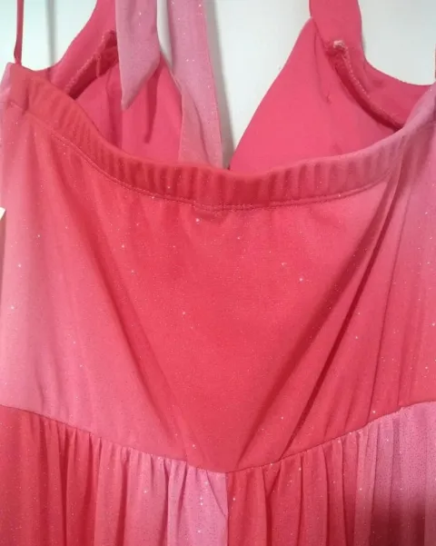 Vestido color degradado Coral con Rosa con brillos, cuello halter asimétrico con cola, no trae cierre ni botones, tiene elástico en la cintura y la espalda, la etiqueta dice M pero es como talla XS o S, ancho Axila=37-44cm, ancho Cintura=56cm, ancho Cadera=58cm, Largo=87-130cm, Te regalo $100 con mi código de descuento si es tu primera compra iuNisj3oSQ