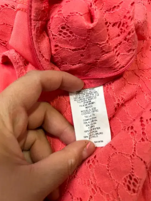 Bonito vestido corto, de encaje, color coral, 👚👗🌈marca SÁHARA, talla 13, ☘️Medidas:hombros 38, axilas 49, largo 82 ☘️Código: A015💟Incluye gratis Regalo Sorpresa💟
