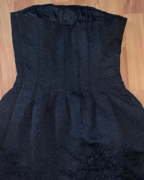 Es un vestido color azul marino con detalle de encaje, y plieges en la falta y la parte de arriba como corset