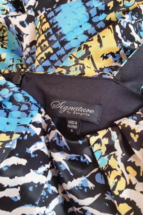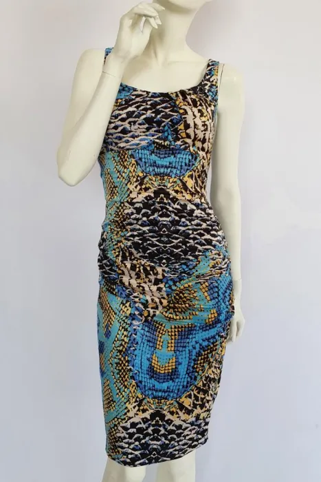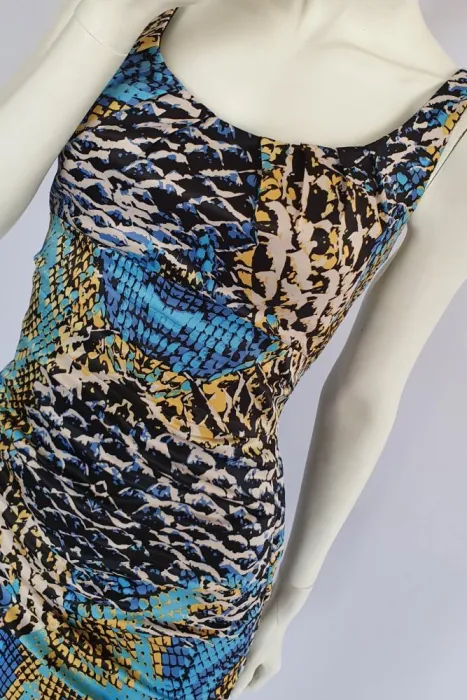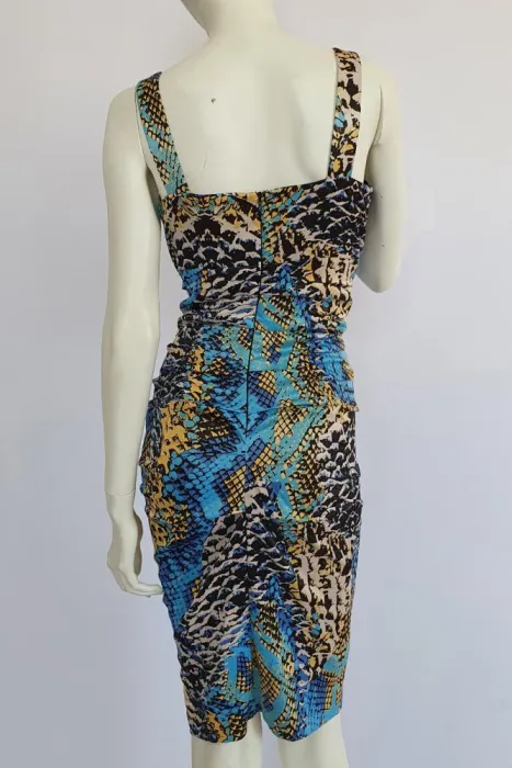 Tela ligeramente satinada. Hermoso diseño drapeado, que reduce la cintura y resalta la cadera. Trae forro. Nuevo, CERO DETALLES.Talla M.Busto: 48cmCintura: 40cmCadera: 50cmLargo: 104 cm