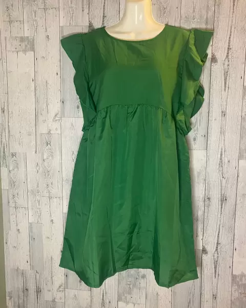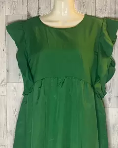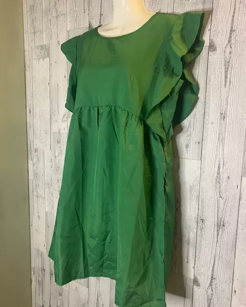 Vestido corto con bolsas en color verde, ajusta bonito por el corte tipo imperio, lo que disimula y hace ver bonita figura. Las medidas son: - Pecho: 102 cm - Contorno cintura: 105 cm - Caderas: 150 cm - Largo: 95 cm