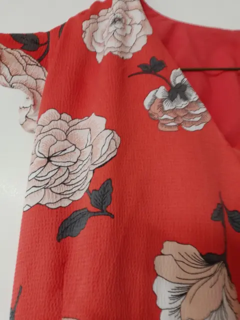 Vestido corto. Vestido elegante, color salmón y flores, manca corta escarolada , cuello en V, bonita caída y corte, T XS,