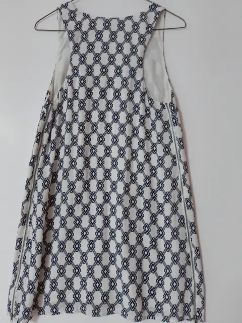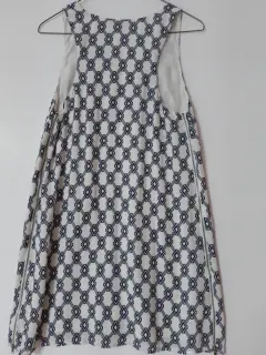 Vestido corto sin mangas, corta en A, con una caída hermosa, casual pero elegante, TS, beige y dibujos en azul marino