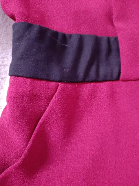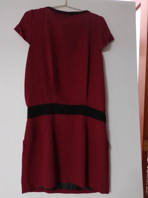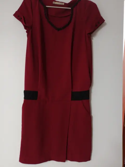 Vestido corto. Vestido elegante, color vino y detalles en negro, cuello en V, manga corta con detalles y bolsas, tipo corte camisero suelto