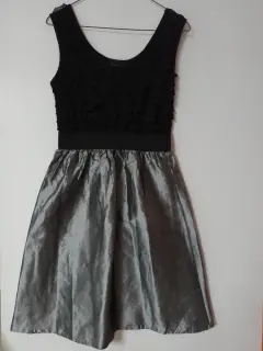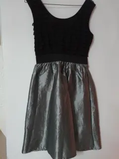 Vestido corto. Vestido elegante, arriba negro drapeado, elástico, falda de tafeta color gris plata, cómodo, de cintura elástica, práctico y a la vez muy vestidor