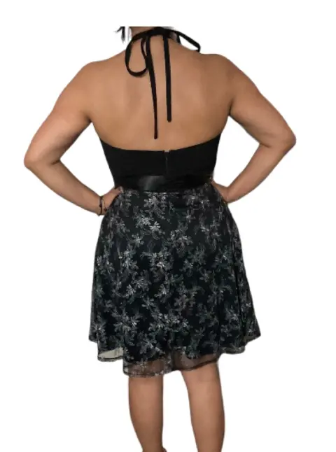 Lindo vestido en color negro Con detalles con hilo color plateado Talla MMedidas 44 cms de cinturaLargo 85 cms