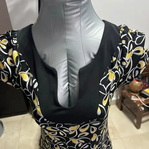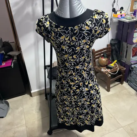 Vestido corto, manga corta, caída línea A, tela muy fresca y suave, negro con blanco y amarillo.