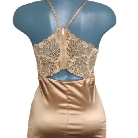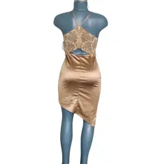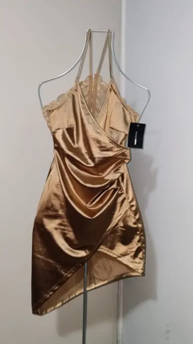 Vestido corto Fashion Nova L,viene reducido por lo que una talla M queda bien Color dorado Satinado con cierre en la parte de atrás
