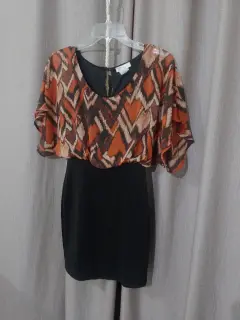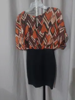 Vestido corto. Es un vestido corto Simula falda corta en color negro y blusa de color combinaciones naranja, la tela de la blusa es transparente y tiene forro en color negro