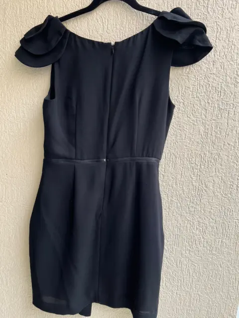 Vestido corto. Vestido corto con cierre asimétrico delantero simulado , abarca toda la cintura medidas largo 86.5 , ancho 72 cms, busto de axila axila 90 cms con detalle en manga en capas , talla chica en la foto se ve pálido pero es negro con forro marca BCBGeneration, nuevo