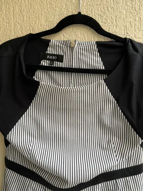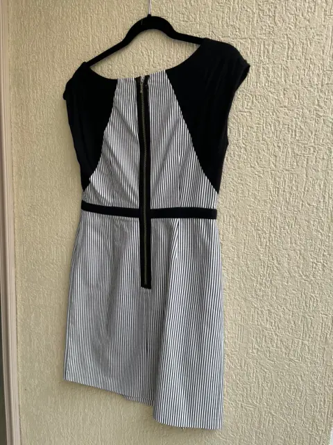 Vestido corto. Combinado la parte superior en negro y la parte del vestido rayas verticales negras con fondo blanco , medidas largo 88 cms , ancho 78cms, busto de axila a axila 94 cms talla chica o sea seis , con cierre visible en la parte de atrás , estiliza