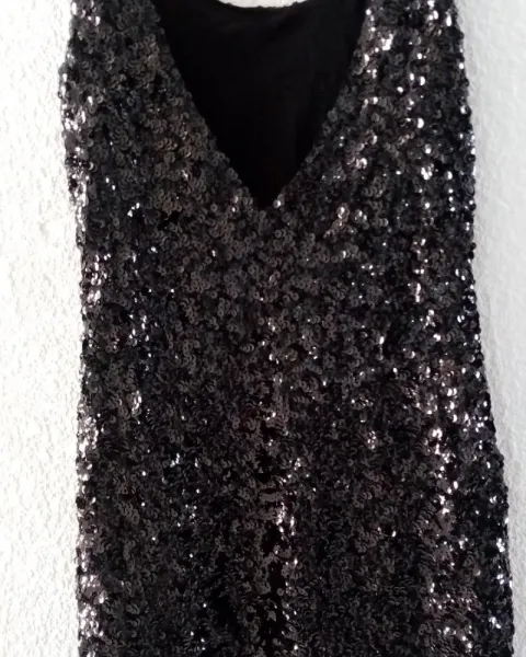 Vestido corto. Vestido negro de lentejuelas color negro, corto, ajustado y se ve lindo puesto.