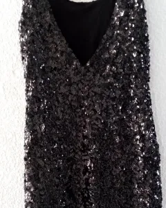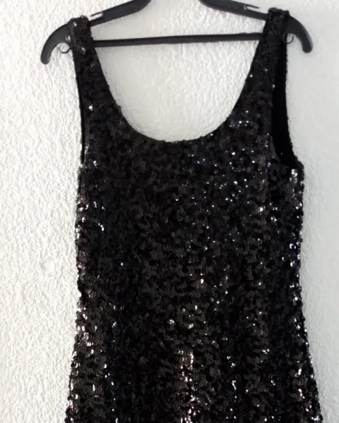 Vestido negro de lentejuelas color negro, corto, ajustado y se ve lindo puesto.